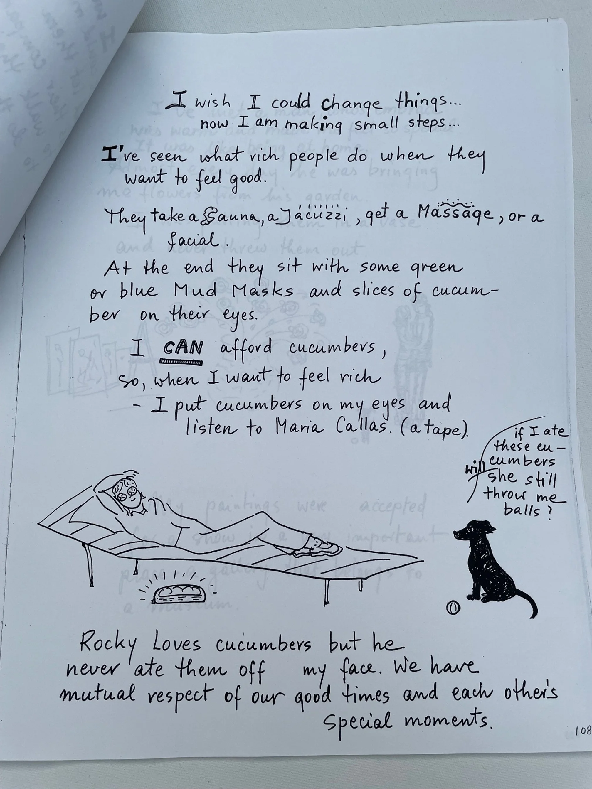 Was she happy? Really she thought so. At the very least, she was actually beginning to feel somewhat secure. Secure for the first time in — forever? At the end of her work days sometimes, she would even allow herself to take a rest from the painting and poetry and just enjoy life, some lounging with Rocky out by that pool. She would play music from a cassette player and put cucumbers over her eyes because she’d seen that rich people seemed to enjoy this. Rocky would come over and drop his ball by her hand, and she would feel around for it and take it, toss it, and he would fetch it, bring it, drop it again. (And even though he loved cucumbers, he respected her tranquility enough to not eat them from her face — but still, here’s the ball…)