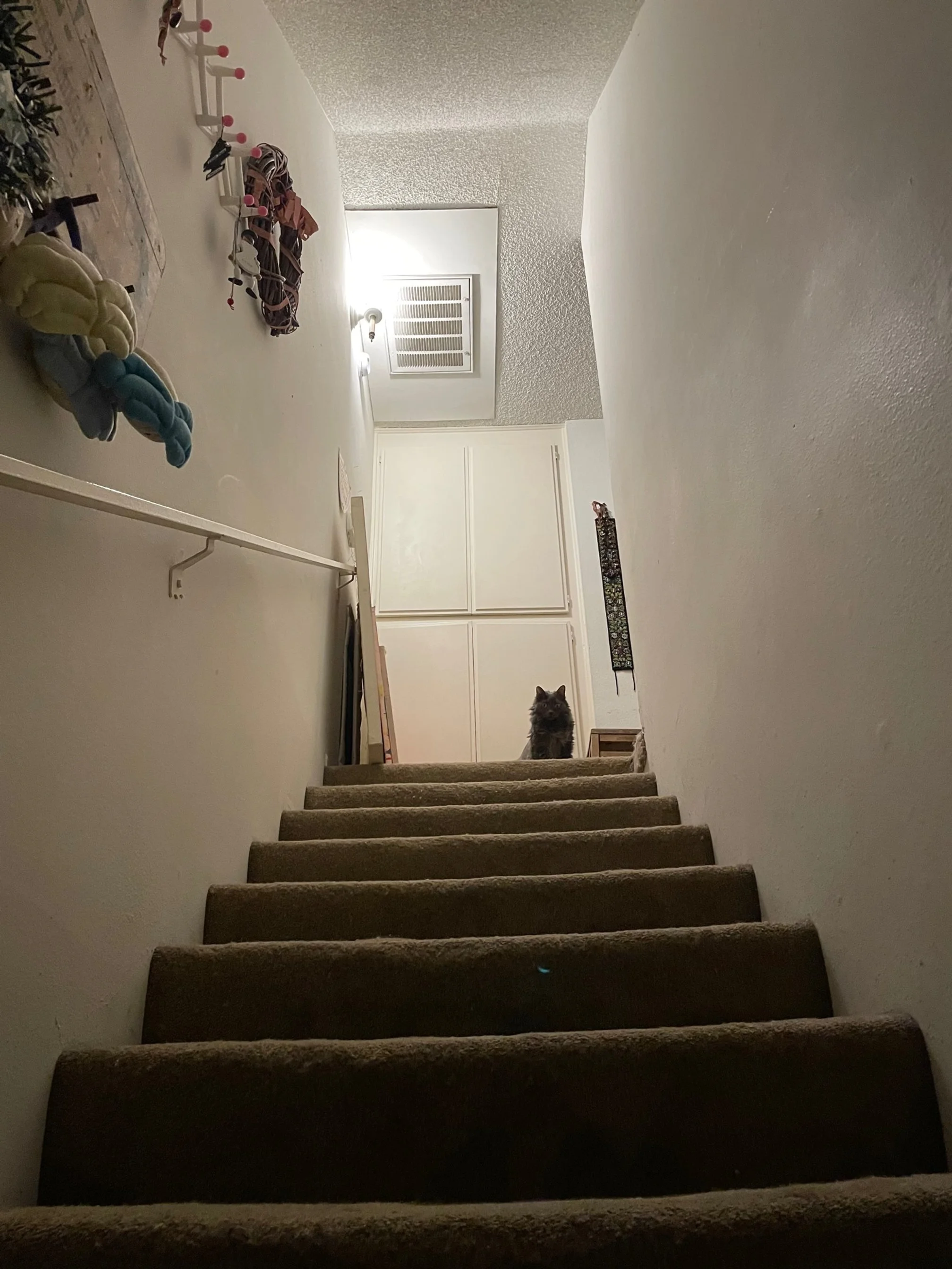 But then later, I see it too. Actually I hear it first, and then I see it. I hear a strange meow from a strange place, and I go to find it, and finally find him wedged behind a fold-up chair in an awkward position, in this place he simply never goes. I go to him there, I remove the chair he’s behind, and when he gets up, he wobbles. He stumbles. He can’t walk straight.