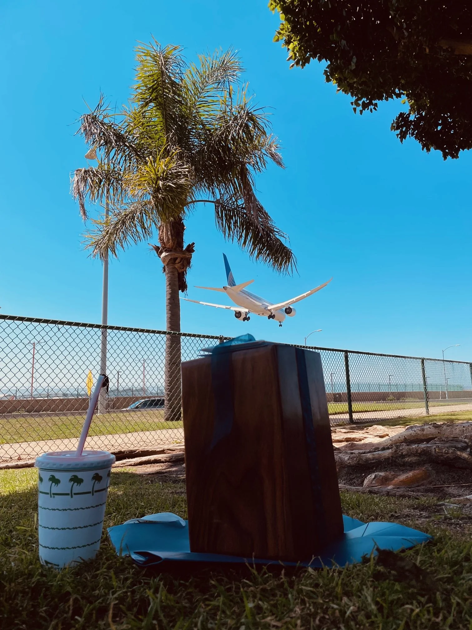 But I did as Mom asked. I picked her ashes up and then went straight to the In-N-Out Burger at the foot of the runway of LAX, a place that means something to us, and I got double-doubles and a strawberry shake, as we used to. And I went to the grassy area there among the trees, as we used to. And watched the planes land and take off, as we used to. Heard the roar of the jet engines, heard and felt the energy of movement and flight overhead and also through me, through us, as we used to.