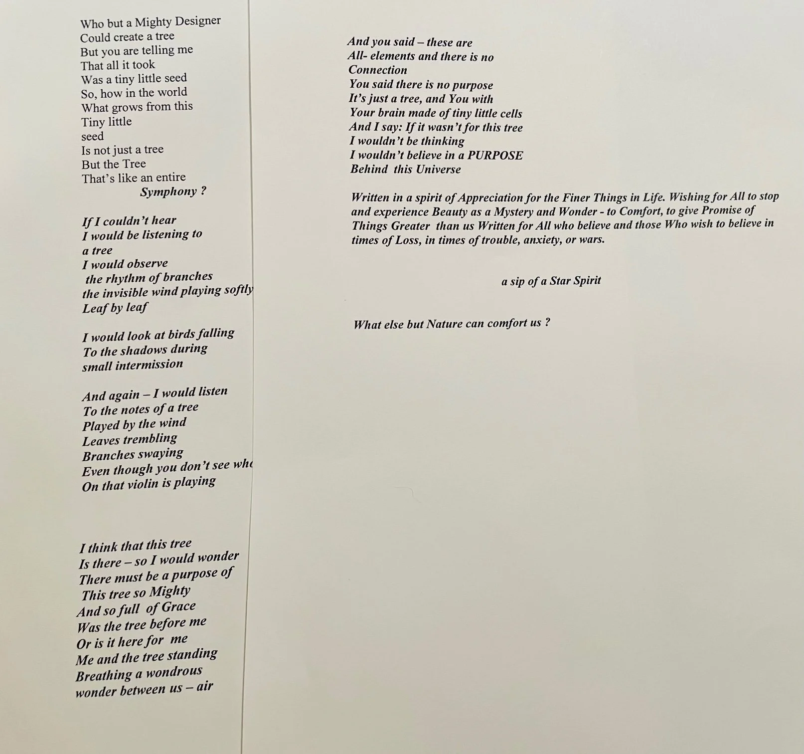 Written in a spirit of Appreciation for the Finer Things in Life. Wishing for All to stop and experience Beauty as a Mystery and Wonder — to comfort, to give Promise of Things Greater than us. Written for All who believe and those Who wish to believe in times of Loss, in times of trouble, anxiety, or wars.