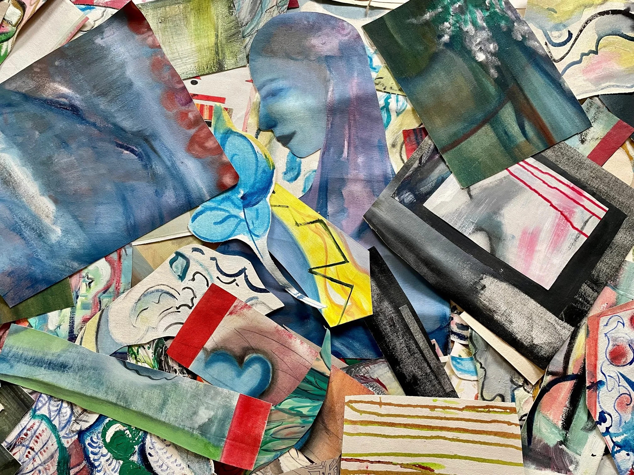 She’ll mention shapes again, here in the next pages of her book. The one we’ll finish now, at last. And I’ll find mounds of shapes after she’s gone, upstairs in the other room — cutouts, fragments. Fragments from other paintings, past canvases. Fragments maybe of failures, which could be made now into other somethings.